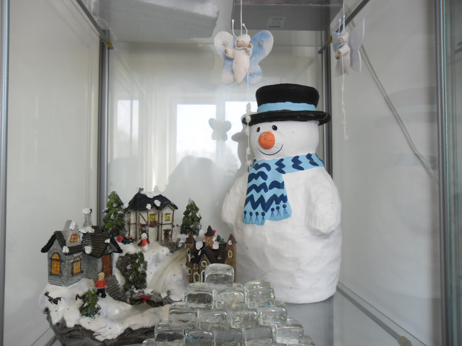De sneeuwman kocht ik ooit op een rommelmarkt in Belgie op de terug weg van een vakantie.  De engeltjes van vilt zijn de enige eigengemaakte dingetjes in dit gedeelte. Grappig is het iglo muurtje hè?