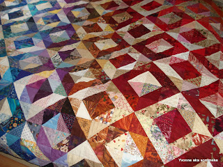 Bij de Bee waar ik 12 jaar geleden zat,hebben we lapjes geruild van 10x10cm. Daarvan heb ik deze quilt gemaakt.Alleen de laatste 2 rijen moesten er nog aangezet worden.Helaas zit deze quilt al 10 jaar in een verhuisdoos,en welke????